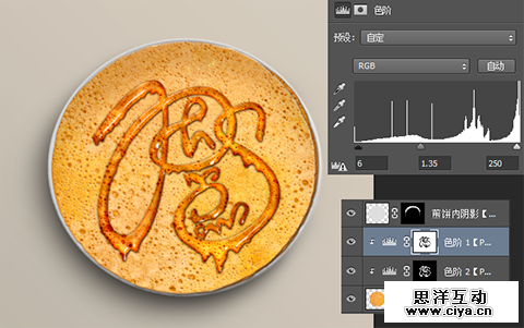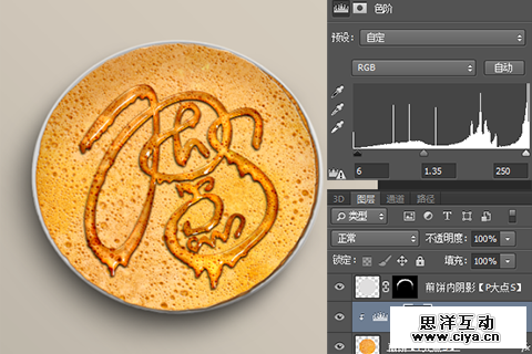 下面,我们调整一下“煎饼”的颜色,把文字周围的煎饼颜色调亮一些。选择“P大点S 1”图层,载入选区,反选,不要取消选区,回到“煎饼”图层,添加一个“色阶”调整层,并创建剪贴蒙版,“色阶”的设置如下: