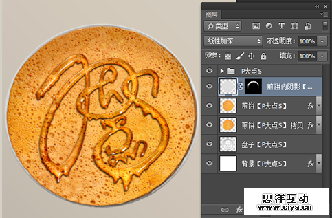 新建一层,命名为“煎饼内阴影”,置于“P大点S”图层组下层,“煎饼”图层的上层。选择“盘子”图层,载入选区,填充#DFDEDE,添加蒙版,将更改图层混合模式为“线性加深”,再用画笔工具把不需要显示的地方涂抹掉。