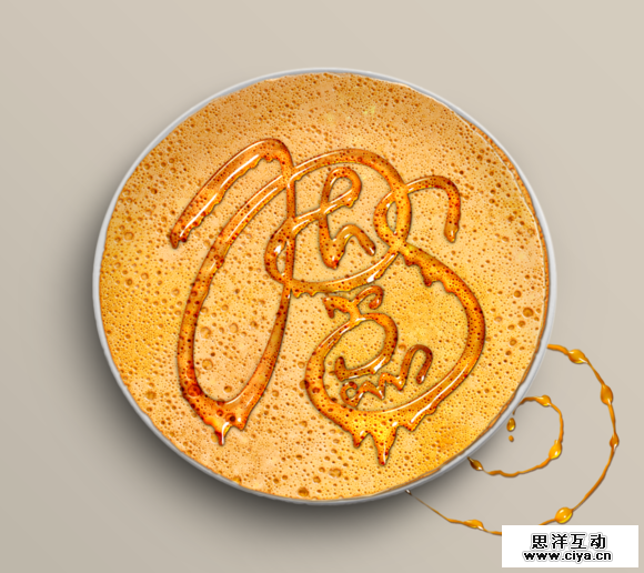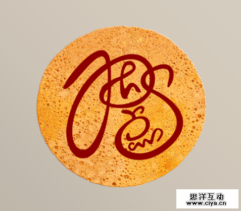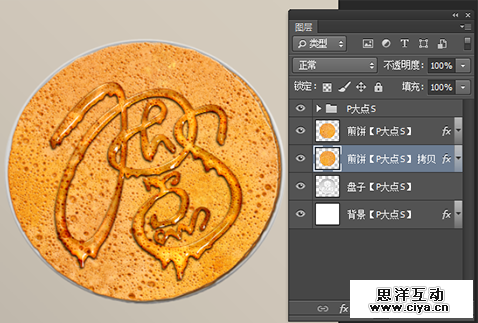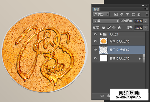 置入“煎饼”素材,居中摆放,打上文字,我这里的文字使用的是“P大点S”四个字。直接输入文字的话,建议使用圆滑一点的字体,文本的颜色在这里无所谓,因为等会我们会应用图层样式,什么颜色都没影响。