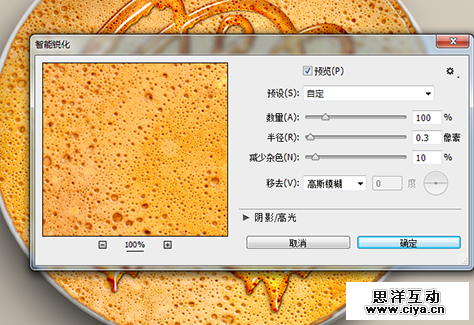 现在,我们来强化一下煎饼的质感。选择“煎饼”图层,执行“滤镜—锐化—智能锐化”,设置数量为100%,半径0.3像素,减少杂色10%。