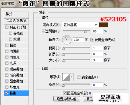 一样的道理,没有阴影显得不真实,下面我们给“煎饼”图层添加一个阴影,这里直接用的图层样式。设置如下: