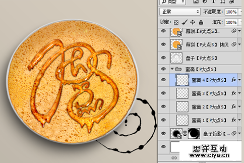 我们置入“蜂蜜滴”素材,将其摆放于“盘子”图层下层,“盘子投影”图层的上层,创建个图层组,把“蜂蜜滴”素材拖进去,并复制四层,跟刚才文字的做法基本上一样,为了直观,我们依旧将这四个图层命名为“蜜滴1 2 3 4”,同样的,将这四个图层的填充设置为0%。