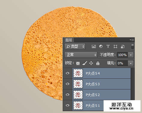 将文本图层复制三层,得到了总共四个文本的图层,并将四个文本图层的填充都更改为0%,为了等会阐述的方便和观看的直观,我将四个文本图层命名为“P大点S 1 2 3 4”。