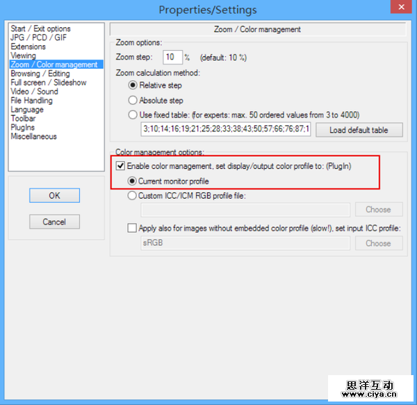 其次,各种第三方看图软件,比如ACDSee和IrfanView,默认是不做色彩空间转换的。所以你要做的是到更改它们的设置,把色彩管理的选项给勾起来。