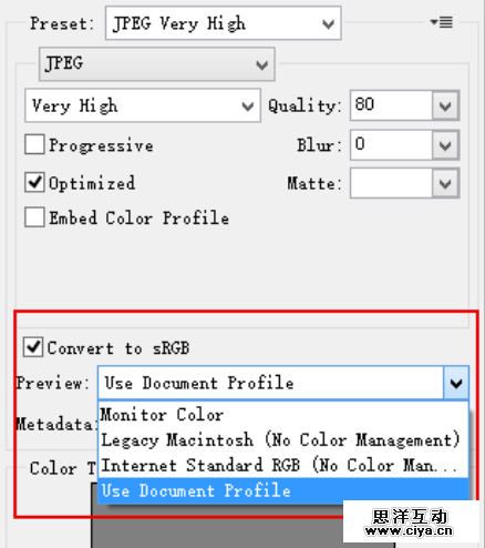 sRGB就是浏览器里看图片的最保险的色彩空间,因为WINDOWS默认色彩空间就是这个,而WINDOWS又是最被广泛使用的操作系统。各个显示器厂家在生产的时候,也尽量保证sRGB色彩空间显示出来不会太离谱。可以说,把图片导出到sRGB色彩空间的这个做法,就是针对网络浏览的最佳实践,所以请务必勾选。