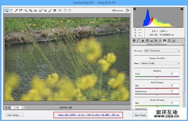 如图所示,红框里的就是ACR渲染RAW时候的设置,用的是Adobe RGB色彩空间,每个通道的深度是16位。