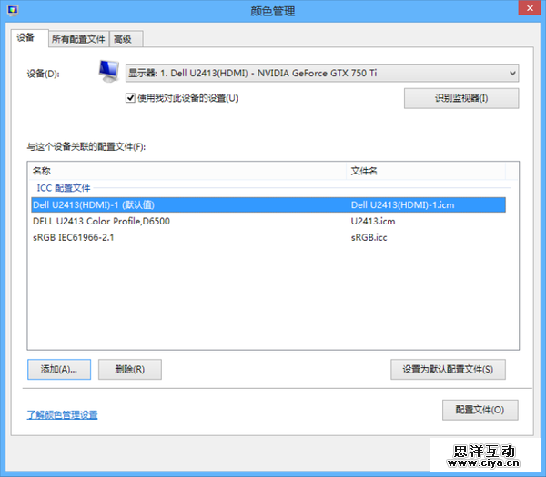 就拿我的WINDOWS机器举个栗子,经过校色之后的系统设置如图(控制面板->颜色管理,即可进入该界面)