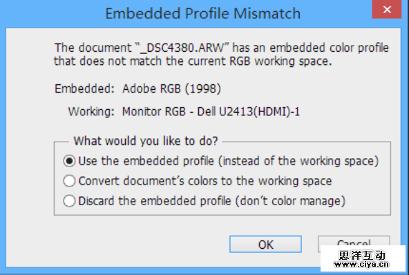 简单来说,就跟我们追求大的动态范围是一个道理,如果图片内嵌的色彩空间大于你当前的色彩空间,那么保留。比如在这个例子里,Adobe RGB是比U2413要丰富的,那我们选第一项来保留原有色彩空间。而如果原图内嵌的仅仅是sRGB这样的货色,那转成U2413这样的广色域也未尝不可。