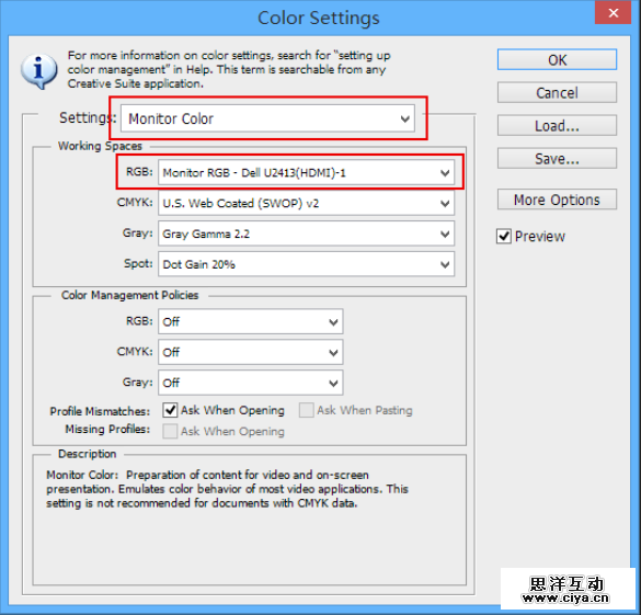 看上去非常绕,事实上以上两项无论你选哪个,影响的都只是PS的内部运算,而在显示的时候,PS都会把颜色转换到U2413,所以最终看到的效果都是一样的。