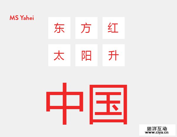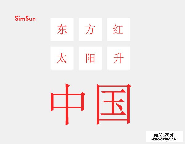 中易宋体,或者更广为人知的英文叫法 SimSun,与它的前任,新宋体 NSimsun 就是简体中文中的 the Times New Roman,因其内置于 Windows XP 系统而变得流行。中易宋体一直饱受喜爱:它依旧是Windows 7 中文的默认字体。如果你去问一个中国网页设计师是什么让页面更有“中文范”,他们通常会微微一笑然后回答 “SimSun,12pt” ——这就是这种字体究竟有多么普及的最好证据。