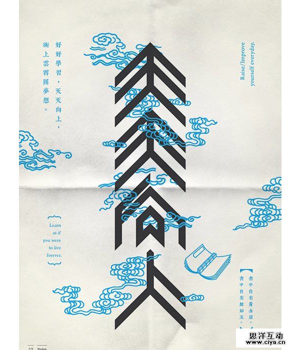活学活用时间!这里有些不错的中文版式设计,首先是来自澳门Tun Ho的海报。这幅作品包含四个汉字,从上至下,是中国的一句俗语:“天天向上”。你可以发现作者将汉字变成了指向天空的箭矢,而环绕四周的祥云则揭示了其中的含义。