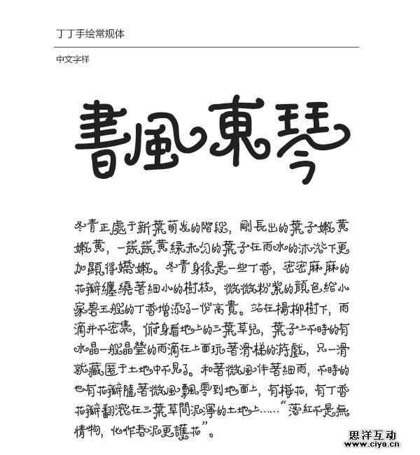 美术体是一类极具风格的字体,它们可以包括从稚嫩到厚重到新奇的各类风格——正如其名“美术”所指。为了在线上使用这类字体,你可能需要矢量图或位图来实现,或者启用极具实验性质的亚洲字体库“有字库”。下面就是丁丁手绘体,一款来自造字工房的打着圈圈的字体: