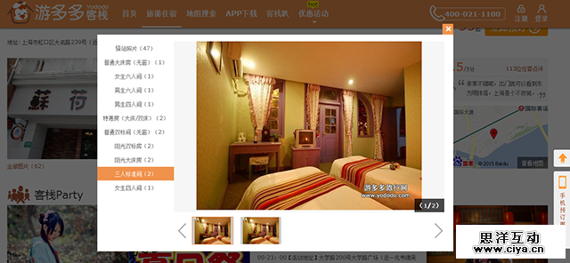 在酒店详情页中最受关注且最先出现的是关于酒店的一些图片,而这些图片内容对用户来说可能又爱又恨。当用户正在浏览的时候会觉得图片表现完整但有些杂乱,而当用户没需求的时候又会因为一些正常的操作造成误点。如果网站能先展示一部分图片,让需要查看更多图片的用户点击进入一个专门的图片板块,并且对这些图片进行分类,便于用户有针对性的快速找到自己需要的内容,这样的设计才更符合用户体验。