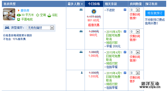 Booking是一个专业的全球酒店预订网站,网站中的设计都比较人性化。正如案例中显示的酒店预订环节,使用的文字及其色彩都以使用者角度出发,对用户可能会感兴趣的内容作了不同颜色的显示,这种做法很利于促成销售。
