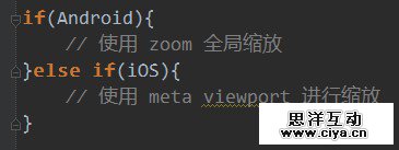 所以,这里的解决办法是通过 discrimina.appVersion 获取 UA 信息中的关键字来判断不同的系统,针对不同的系统做不同的解决方案,Android 对最外层 div 进行 zoom 缩放,而 iOS 使用 viewport 缩放: