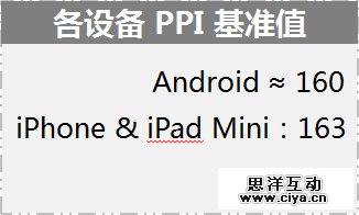 注意,这里给的是基准值,我们常说的 iPhone 多少多少 PPI,那个值是用基准值乘以设备像素比得出来的。由于 Android 手机厂商众多,并没有统一的标准,这里的 160 只是约等值,所以 Android 屏幕尺寸结果会有误差,但是基本也够用了。
