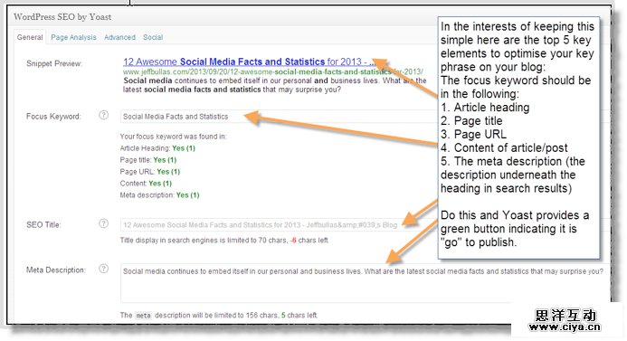 下图的截图展示了名为Yoast的工具如何帮助网站进行搜索引擎优化: