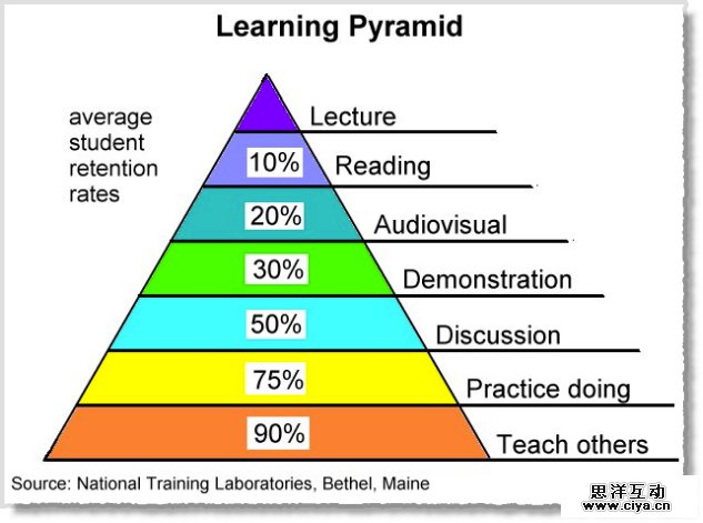 值得注意的是,多媒体媒介中,所涉及到的感官越多,内容的保留率越高。下面是Edgar Dale 的“学习金字塔”,这幅图也正好证明了这一点。