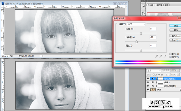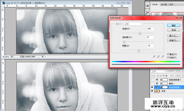 图2到图3就简单多了。最核心的变化就是色相咯。这种单色又非黑白的色调在调整色相时一定要勾选“着色”,拉选色相条至差不多的色调后调整饱和度和明度: