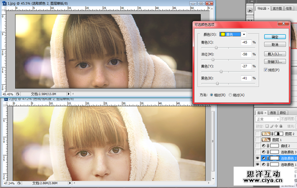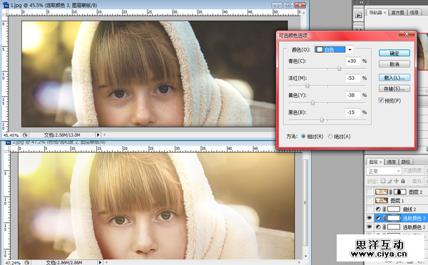 这个时候你已经可以看出你调整的神奇效果了。继续!通常可选颜色中的白和黑也很有用,白色负责高光,黑色负责阴影。你看,经过刚才的调整面部高光呈现黄色,而图2很明显白色,所以调白,降低白色中的黄色和红色成分: