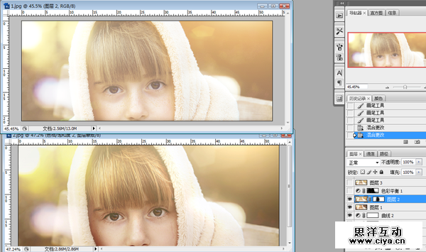 图2和图1对比,很明显的区别有三:一个是明度提高,一个是色调改变,再一个是光晕效果。