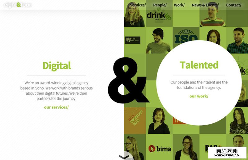 原因之二,有时你要表现出一种重要的两重性。以Eight and Four网站为例。他们在此要表达的是,他们的核心竞争力来自植根数字领域,还有多才多艺的员工。这两点成就了他们。通过屏幕分割来表现这一点,是种令人愉快的方式。