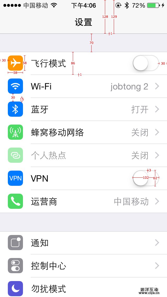 以下是在写视觉规范前一部分对iPhone几个较为典型界面的总结,一方面是了解苹果的一些默认数值,另一方面是对视觉规范有个大体的参考基础。