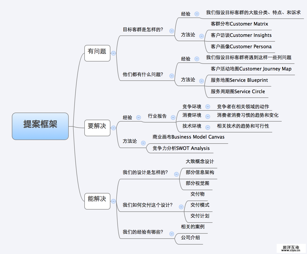 理解了一个提案的基础策略和相关战术之后,一个基本的提案框架应该是怎样的?我经常采用三段式:有问题、要解决、能解决,贯穿经验假设和方法论两个维度的架构,如图3所示脑图,图中的方法论不代表全部,只做举例: