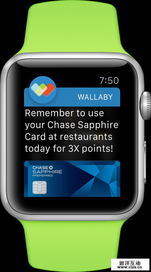 Wallaby目前只将通知限制在一些重要事件上,例如告知用户今天有某张卡片提供打折活动,以及账单和年费信息等。将来,随着Watch自身硬件能力的不断提升,我们将有可能在不消耗过多Watch和iPhone电量的前提下精准的获取用户所在的位置,届时我们就可以在用户进入某家商店或卖场的时候即时发出通知,让他们知道哪些信用卡适合在那里消费,使用户无需自主发起查询便可以获取最适合当前情境及行动目标的信息。