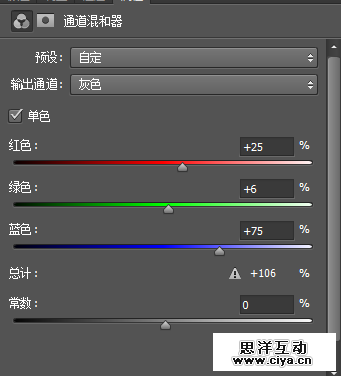 二:盖印图层,然后选择通道混合器,选择单色,参数如图,可根据自己需要酌情调整: