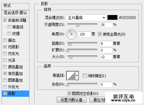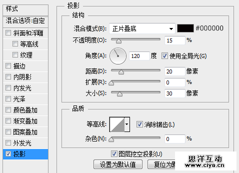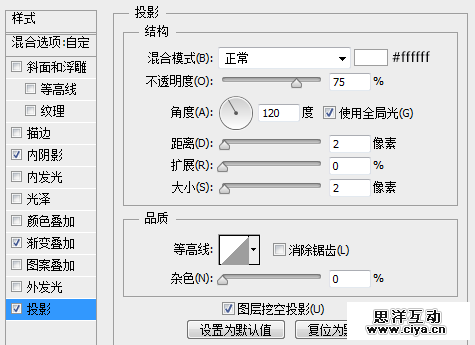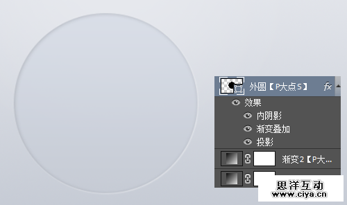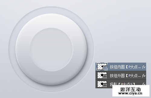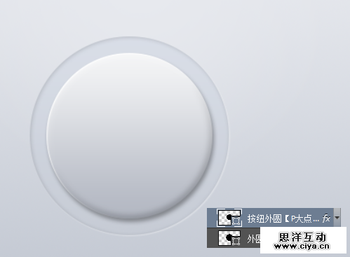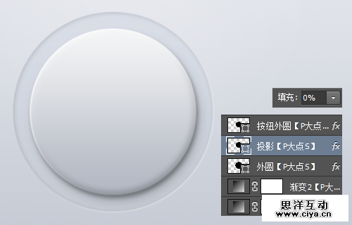 复制一层按纽外圆图层,将其命名为投影,放置在按纽外圆图层下层,右键清除图层样式,将填充更改为0,添加一个投影图层样式。