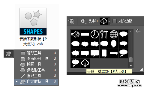 到这里,下载图标,我们就画好了,你要再不会画,我也没办法了。P大点S作为一个热爱分享的小团队,免不了在这里我也会将这个形状定义到预设分享给大家,在附件中,你可以找到,那个.CSH的文件就是了,导入到PS中,你可以在自定义形状中找到这个形状。