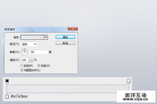 再创建一个“渐变”调整层,模拟背景上的顶部中央位置的高光效果。 设置为#e7e9ee到透明的90度的径向渐变。