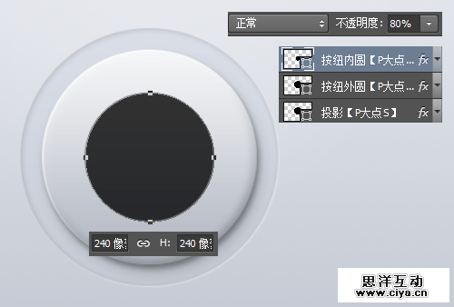 下面,我们画按纽内部的那个圆,用椭圆工具画一个240*240像素的圆,将图层不透明度设置为80%。