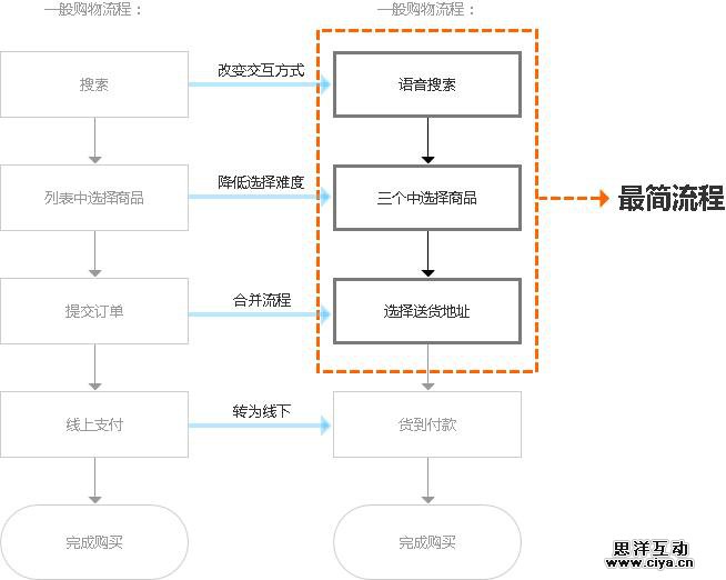 减少用户选择难度,把线上流程放到线下。一般购买流程:搜索——选择商品——提交订单——支付定订单。而在watch上我们让用户使用语音搜索后,只展示与用户相关度前三的商品,用户很快就能做出选择。然后直接选择地址就能提交订单。我们砍掉了庞大的线上的支付流程,改为线下的货到付款。这样精简了线上流程后,用户就能想到时随后立刻完成线上购买。