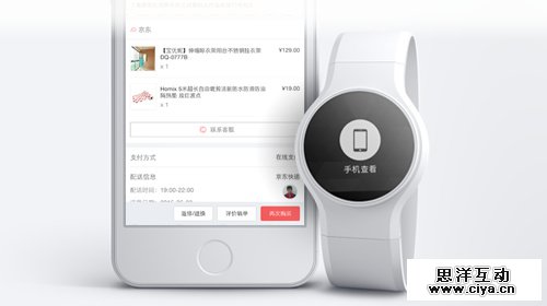 在涉及订单详情时,不可避免地需要引入一些更复杂的交互,强迫用户必须在可穿戴平台上完成这些操作当然是不合适的。我们将用户引导到与之相匹配的手持设备之上,在这里他们能够通过大尺寸屏幕完成这项任务,而后再返回可穿戴设备获取操作结果。点触操作按钮会启动用户匹配智能手机上的相关应用页面,用户将在手机上完成的具体交互。