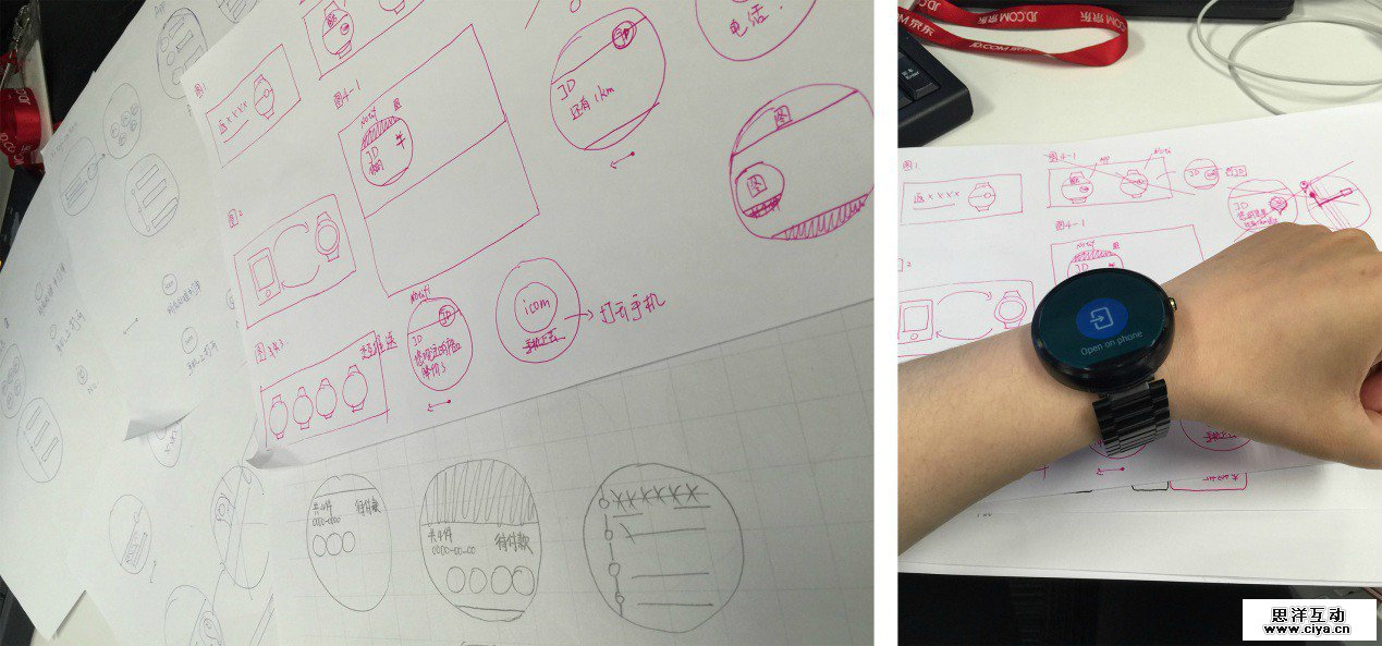 在项目中,我们通过用手绘草稿和纸面原型来和产品、开发快速沟通设计思路,为了最真实地反应我们在设计中存在的问题,在项目中我们还联合开发同学制作了高保真可操作的Demo(在手表上的原型工具还是空白),将整个应用信息框架,交互行为都完整地呈现出来。