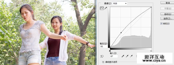 这张图片,一看就是肤色严重偏红,我们先使用曲线提高画面亮度: