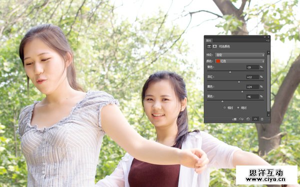 其他参数例如青色、洋红、红色都要根据实际情况确定,比如黄色,我往右边拉的原因是因为我想让皮肤透着一点儿黄色才符合东方人的肤质。