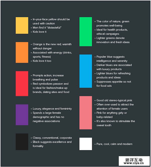 所以,当你开始考虑色彩的心理学属性的时候,尽量将整个配色方案作为整体来进行衡量,而不是单独为某个部分选取一个色彩,以期它能与其他部分协调工作。