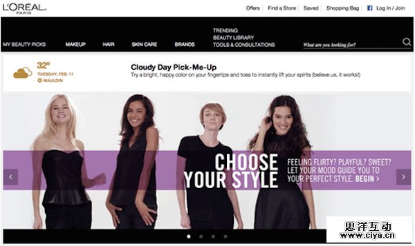 所以,如果你的设计是针对女性的,那么紫色会是一个相当不错的选择,因为紫色在女性受众中普遍受欢迎,但是对于多数男性而言,紫色并不太受欢迎。在下方的图片中,紫色被运用在巴黎欧莱雅的网页中,效果非常不错。主体使用的黑白配色,黑色的页头页脚看起来非常优雅,紫色点缀其中,整体感非常不错。实际上他们的产品并不便宜,但是给人感觉比较高端。