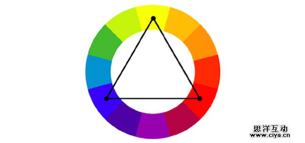 这是最基本的方法,也是最平衡的配色思路,使用互补的鲜艳色彩。在色轮上选取相互间隔120度角的三种色彩,分别来作为背景、内容和导航的色彩。