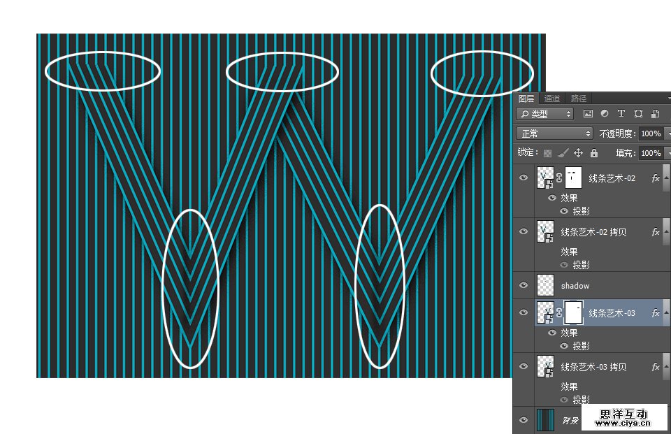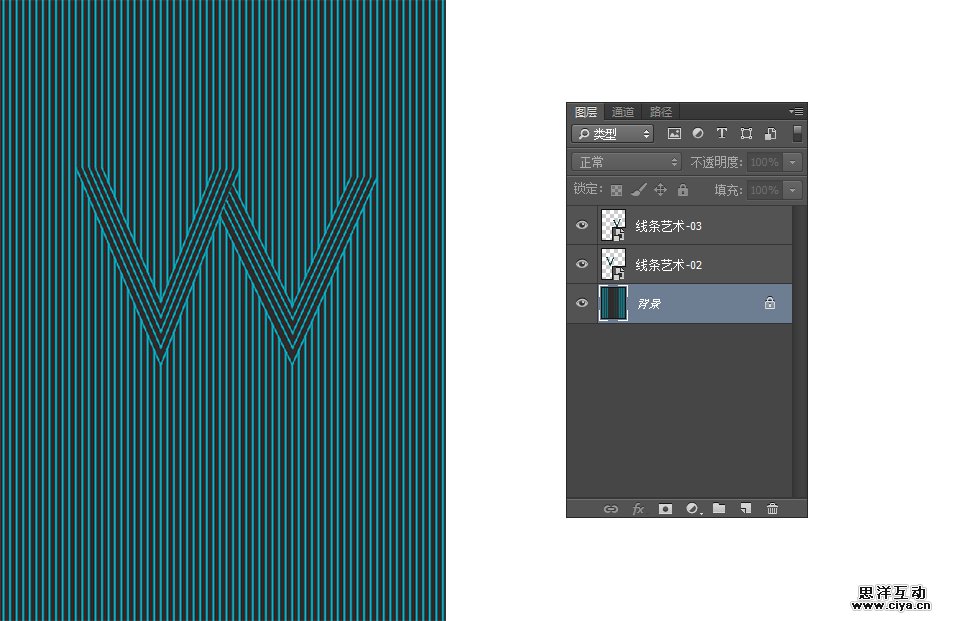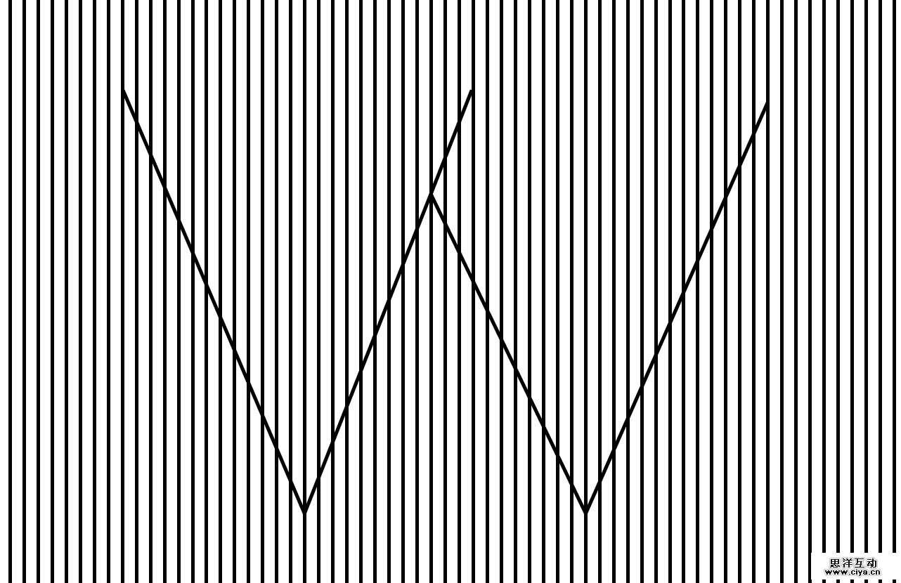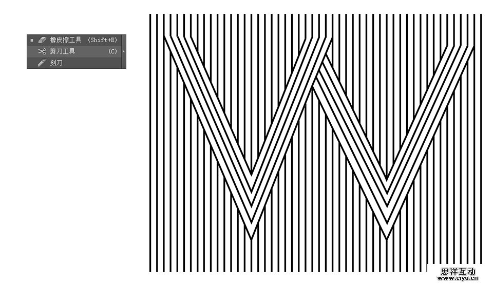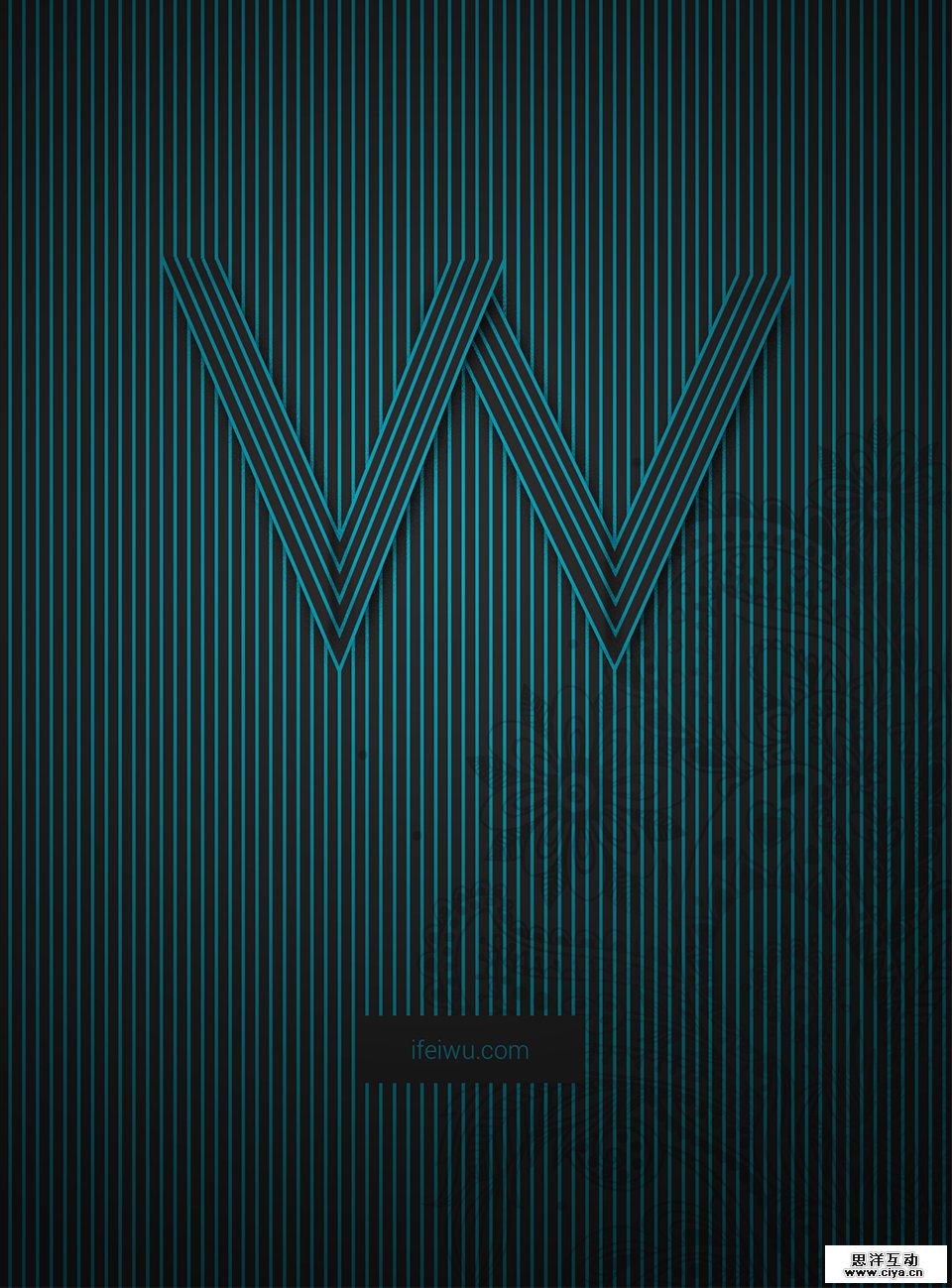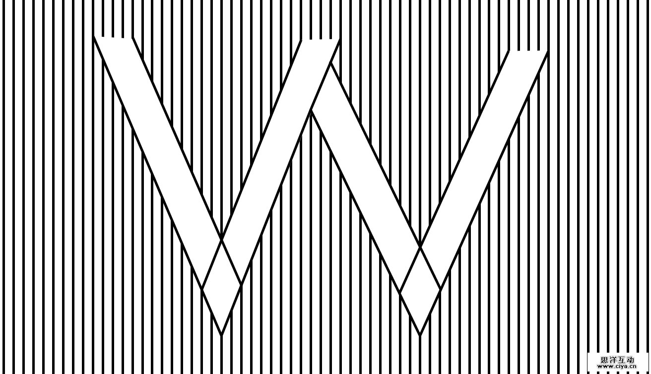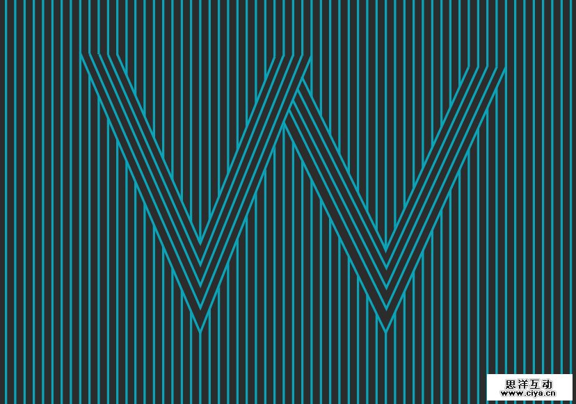 我们开始进入用线条造型,在前言中,我们提到过,要把每根线条视作一个”点”来进行造型。那么具体操作是,先要画出你所要表现的造型线条。你可以使用钢笔工具,也可以用直线工具。例如,我在此要做的是字母“W”。线条的粗细与背景线条的直线大小一样为5px。
