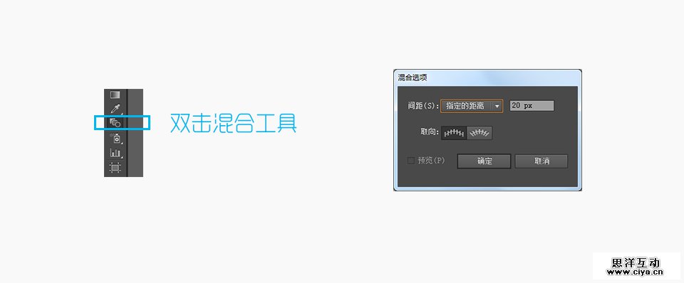 这时,让我们在软件界面左侧工具栏中找到混合工具,双击混合工具的图标,将会在画布上弹出混合选项对话框。在这里你可以参考我的参数,我对混合间距设置为指定的间距,间距距离是20px。对于这里的参数需要加以理解,由于我在之前设置直线的大小是5px,因此,当它们间隔时最好是5的倍数,最终的效果才会显得更加自然。当然这样的造型会显得比较平稳,而打破平静需要更多的加工和构思。
