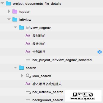 层次方面,让图层和视觉顺序相对应,图层本身的命名也采用「类型_位置_备注」的形式进行标注。比如「bar_project_leftview_segnav_selected」指的就是一个条块,位于 project 模块下的左视图次级导航页面中,功能是标识选中的效果。