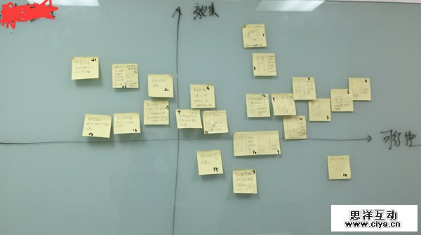 这个时候就要对脑爆的点子进行评估了,拉上做这个项目的设计师和产品经理,最好是大BOSS一起。每个关键词画一个象限表,纵轴叫做解决效果,横轴叫做实现成本,把这个关键词下面的点子往这个象限上贴。