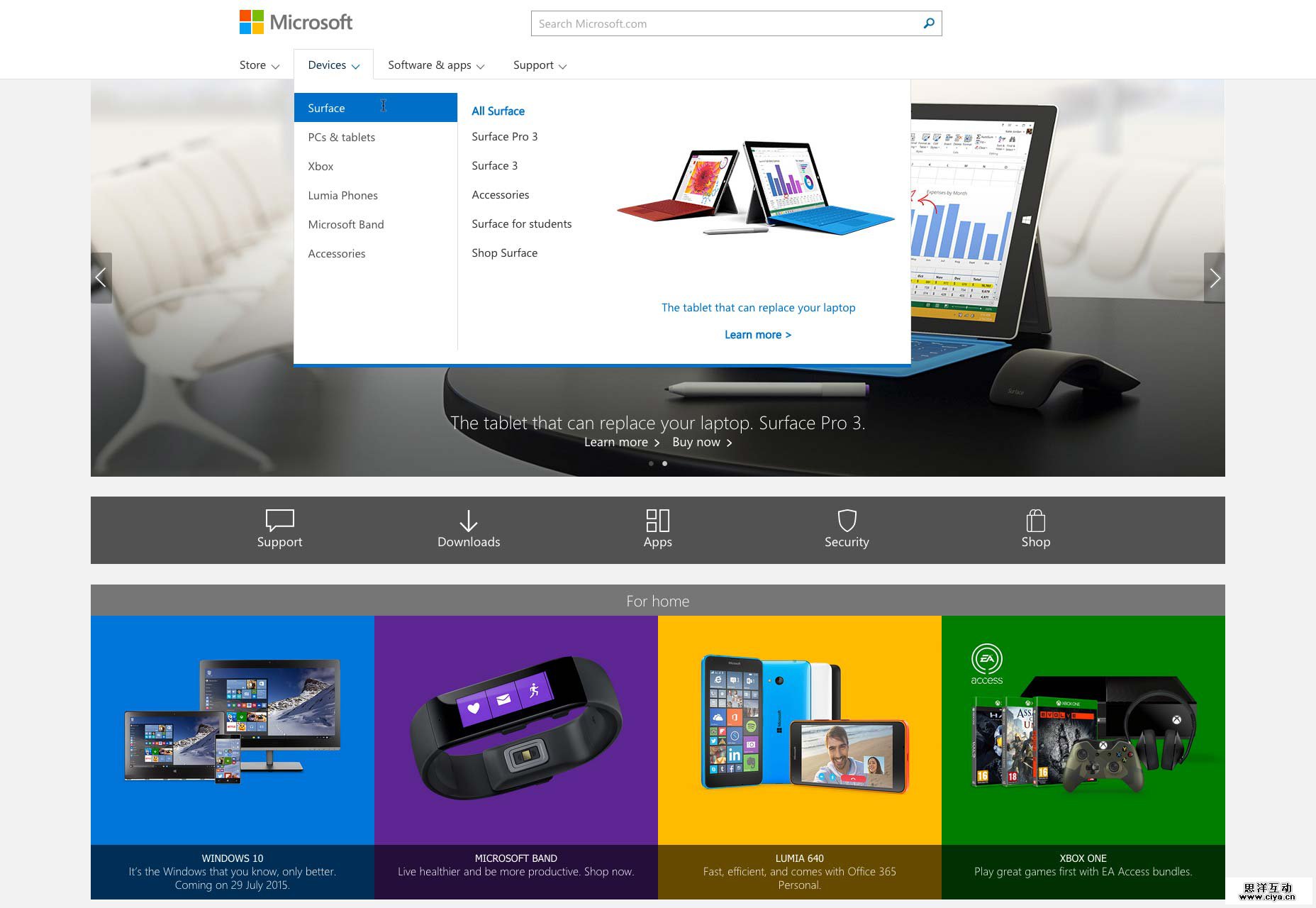 以微软的首页为例,网站的导航栏被划分成四个项目,考虑到微软庞大的产品线,这几乎已经被简化到了极致。也正是因此,每个项目的下拉菜单都被巧妙地分割成为几段,这样一来,导航的层级就清晰了,用户可以更快地找到他们想要的东西,而微软也可以将复杂多样的产品和服务,整合到一个看似简单的导航栏里面。