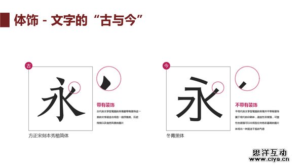 体饰指的是在字体笔画末端的装饰,字体的体饰之间不是有或无,而是多和少,这是一个比较模糊的概念。通常按照笔画体饰的多少划分“古”文字和“今”文字。“古”文字适合作为标题,出现表现自然、传统或者表现历史厚重感的题材里,“今”文字大多是在时尚、科技或者普通生活题材里,“古”文字最重要的特点是抒情,“今”文字则注重简洁。