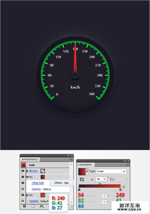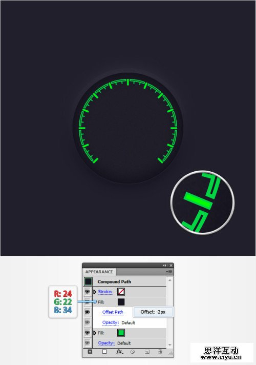 选择“intervals”复合路径,外观面板>添加新填色,设置颜色(24,22,34)。效果>路径>偏移路劲。输入-2px.