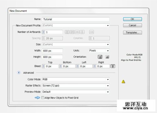 Ctrl+N创建新文档,单位项选择像素。宽高600像素。点开高级选项,选择RGB模式,分辨率72像素。使新建像素与网格对齐为未选择状态。确定。